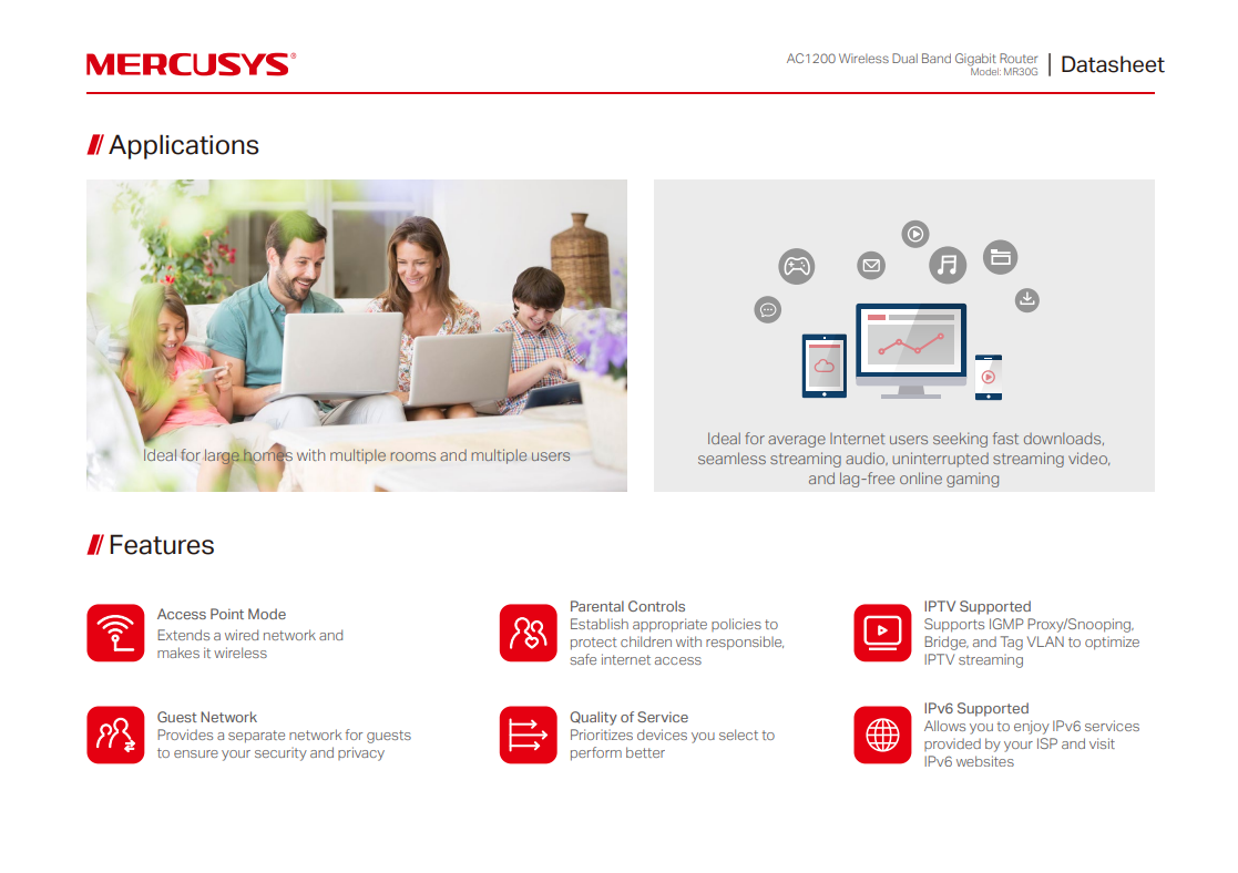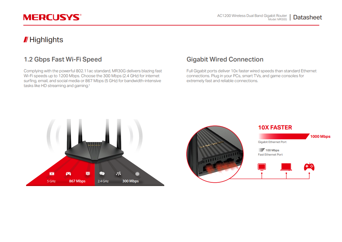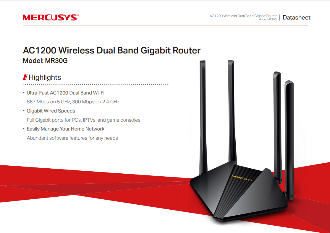 The Mercusys MR30G AC1200Â is a high-performance AC1200 wireless dual-band gigabit router designed to deliver fast and reliable internet connectivity for modern households and small offices. Mercusys MR30G AC1200 comes With speeds of up to 867Mbps on the 5GHz band and 300Mbps on the 2.4GHz band, the Mercusys MR30G AC1200 ensures smooth streaming, online gaming, and file downloads. Mercusys MR30G AC1200 is Equipped with gigabit Ethernet ports, it provides ultra-fast wired connections for bandwidth-intensive devices like gaming consoles and smart TVs.