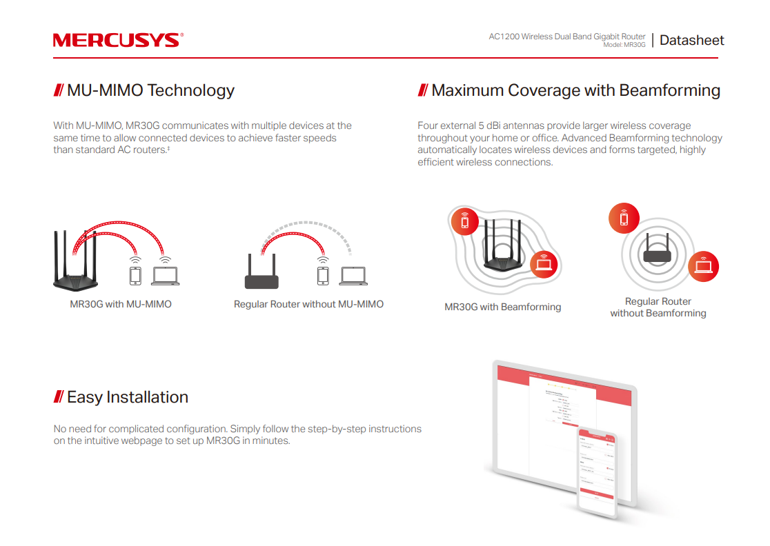 The router features MU-MIMO technology, allowing simultaneous data streaming to multiple devices, improving network efficiency. Mercusys MR30G AC1200 has Four powerful external antennas enhance Wi-Fi coverage, ensuring stable connections throughout your space. The intuitive setup process and robust security features make the MR30G an ideal choice for seamless and secure networking.