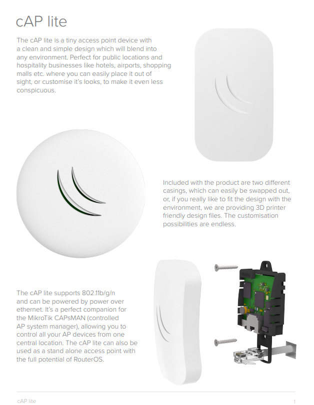 The Mikrotik cAP lite is a tiny access point device, perfect for public locations and hospitality businesses like hotels, airports, shopping malls etc. Included with the product are two different casings, which can easily be swapped out, or, if you really like to fit the design with the environment, we are providing 3D printer friendly design files.
