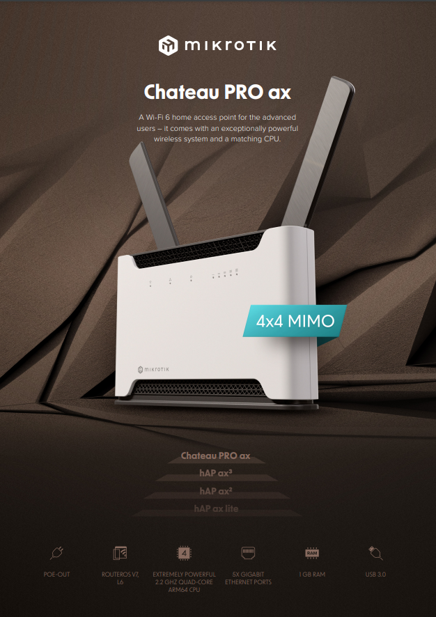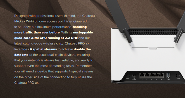 Designed with professional users in mind, the Mikrotik Chateau PRO ax Wi-Fi 6 home access point is engineered to squeeze out maximum performance, handling more traffic than ever before. With its unstoppable quad-core ARM CPU running at 2.2 GHz and our latest cutting-edge wireless chip, Mikrotik Chateau PRO ax leverages 4 spatial streams to achieve double the data rate of the usual dual-chain devices, ensuring that your network is always fast, reliable, and ready to support even the most demanding tasks. Remember – you will need a device that supports 4 spatial streams on the other side of the connection to fully utilize the Chateau PRO ax.