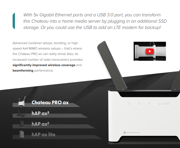 Advanced container setups, bonding, or high-speed 4×4 MIMO wireless setups – that’s where the Mikrotik Chateau PRO ax can really shine! Also, its increased number of radio transceivers provides significantly improved wireless coverage and beamforming performance.