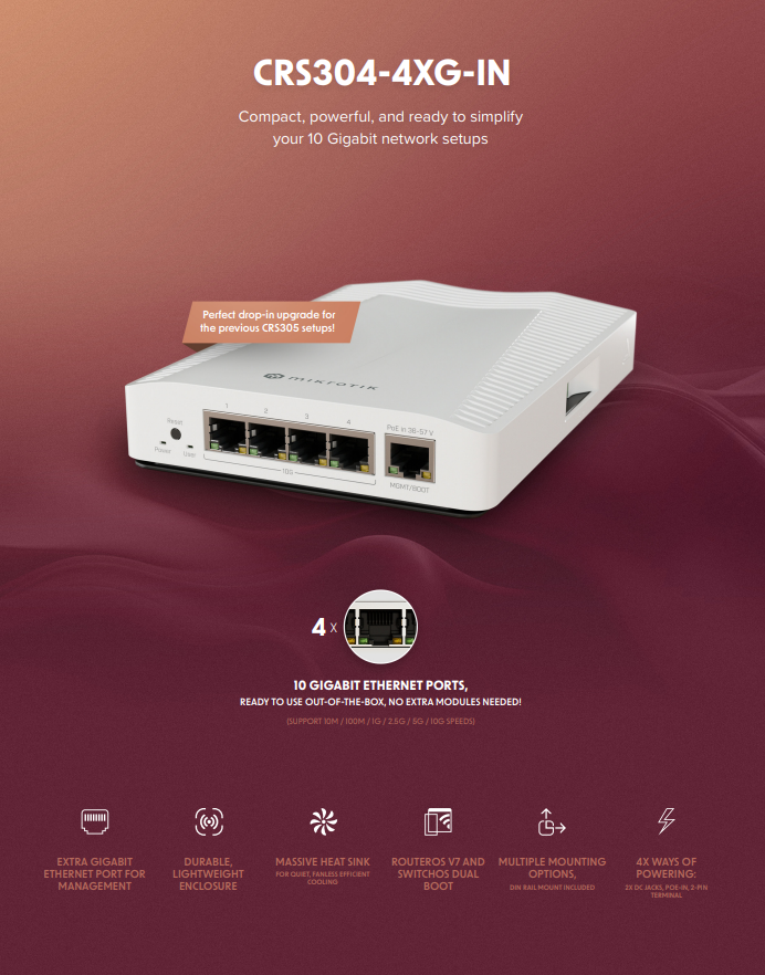 Mikrotik CRS304-4XG-IN compact, powerful, and ready to simplify your 10 Gigabit network setups with 4x10G Ethernet ports ready to use out-of-the-box. No extra modules needed!
