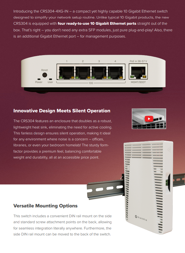 The CRS304’s small form factor and enhanced durability make it an ideal choice for both stationary and mobile applications. Place it on your desk or keep it in your backpack for on-the-go networking – this is a must-have switch for any network administrator.