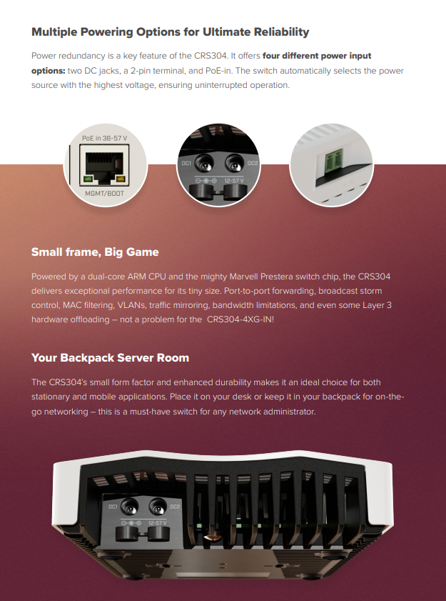 Power redundancy is a key feature of the CRS304. It offers four different power input options: two DC jacks, a 2-pin terminal, and PoE-in. The switch automatically selects the power source with the highest voltage, ensuring uninterrupted operation.