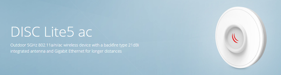 The DISC is a low cost high gain 5 GHz CPE. We have improved antenna design, added Gigabit Ethernet port and 802.11a/n/ac support to achieve even more speed on longer distances.