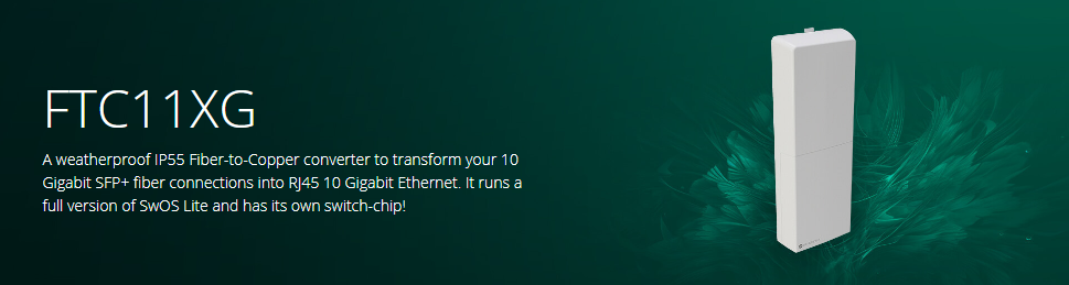 Mikrotik FTC11XG is a weatherproof IP55-rated Fiber-to-Copper Converter with 10G Ethernet and 1G fiber SFP ports, running SwOS Lite. Perfect for outdoor environments, providing reliable connectivity and high-speed network conversion.