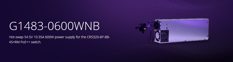 Mikrotik G1483-0600WNB is a 600W hot-swap power supply for the CRS320-8P-8B-4S+RM PoE++ switch, providing 54.5V, 10.35A power. Ideal for mission-critical networks requiring reliable, uninterrupted power delivery with PoE++ support.