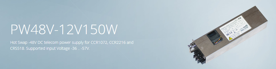 We are now offering a Mikrotik PW48V-12V150W Hot Swap -48V DC telecom power supply (product code PW48V-12V150W), available to purchase separately for use with CCR1072, our newest flagship CCR2216, CRS518 or even the CRS520. Simply remove one of the current power supplies and replace with the new PW48V-12V150W for -48V installations – simple and easy. With Mikrotik PW48V-12V150W Hot Swap You don’t even need to turn off the device. Supports Voltage -36 .. -57V