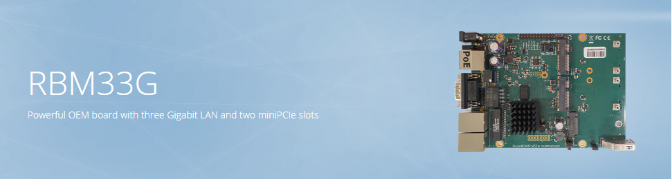 The RBM33G is a fully featured RouterBOARD device perfect for using in your own enclosure or building a custom solution. It uses the same PCB form factor and same mounting holes as it’s predecessors (RB433 and RB953 series).