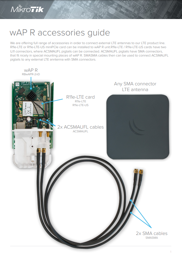 1m SMA male to SMA male cable, that can be used to connect your LTE card (with ACSMAUFL pigtail) to an external antenna if you are using wAP R kit (there are special openings in the enclosure of the wAP R, designed for these cables). 50 Ohm impedance.
