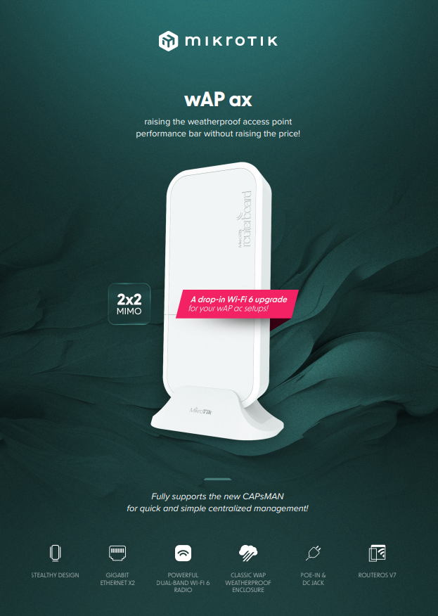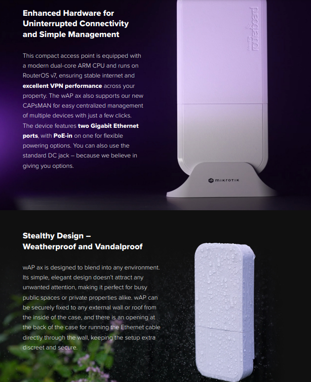 This compact access point (Mikrotik wAP ax, wAPG-5HaxD2HaxD) is equipped with a modern dual-core ARM CPU and runs on RouterOS v7, ensuring stable internet and excellent VPN performance across your property. The wAP ax also supports our new CAPsMAN for easy centralized management of multiple devices with just a few clicks.