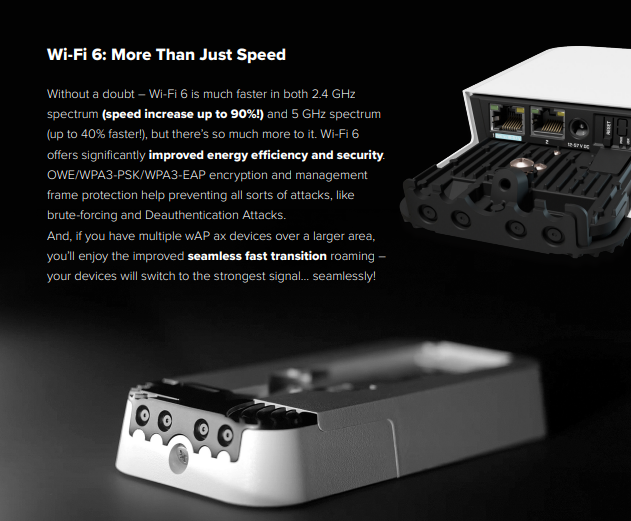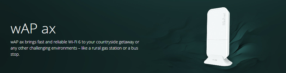 Mikrotik wAP ax (wAPG-5HaxD2HaxD) fast and reliable Wi-Fi 6 to your countryside getaway or any other challenging environments – like a rural gas station or a bus stop.