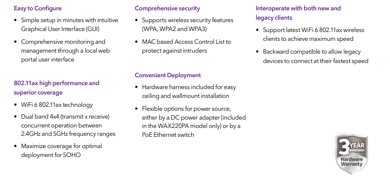 WAX220 comes With support for up to 128 client devices, advanced WPA3 security, and robust performance in environments with heavy network traffic, the WAX220 is perfect for small businesses, remote offices, or home setups demanding top-tier performance. Its intuitive web interface and setup wizard make deployment straightforward, even for non-tech-savvy users.