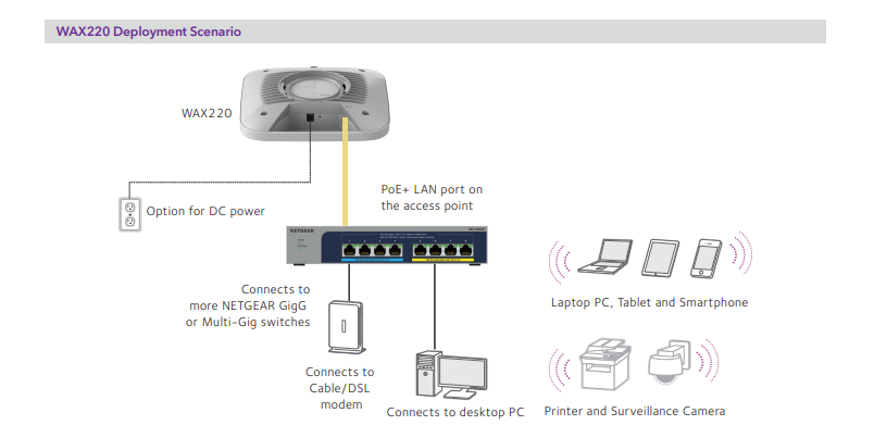 The WAX220 is equipped with a multi-gigabit Ethernet port supporting speeds up to 2.5Gbps, ideal for high-bandwidth applications and future-proof networking. Its Power-over-Ethernet (PoE) capability eliminates the need for extra power cables, simplifying installation and reducing clutter.