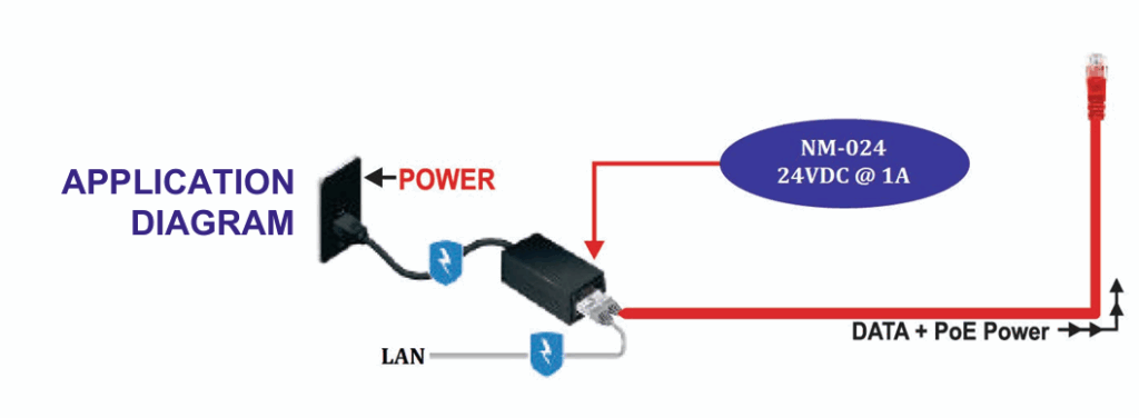 • NM-024: 24VDC @ 1A | 10/100Mbps | Equivalent: POE24V-12W