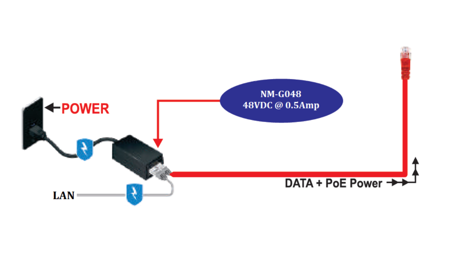 - NM-G024: 24VDC @ 1A | Gigabit | Equivalent: POE24V-12W-G, POE2412G