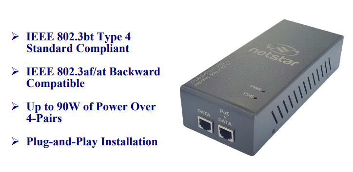 Netstar NM-GPOE90BT has a compact and durable build makes it suitable for business, industrial, and commercial applications, providing a cost-effective and powerful solution for expanding high-power PoE networks.