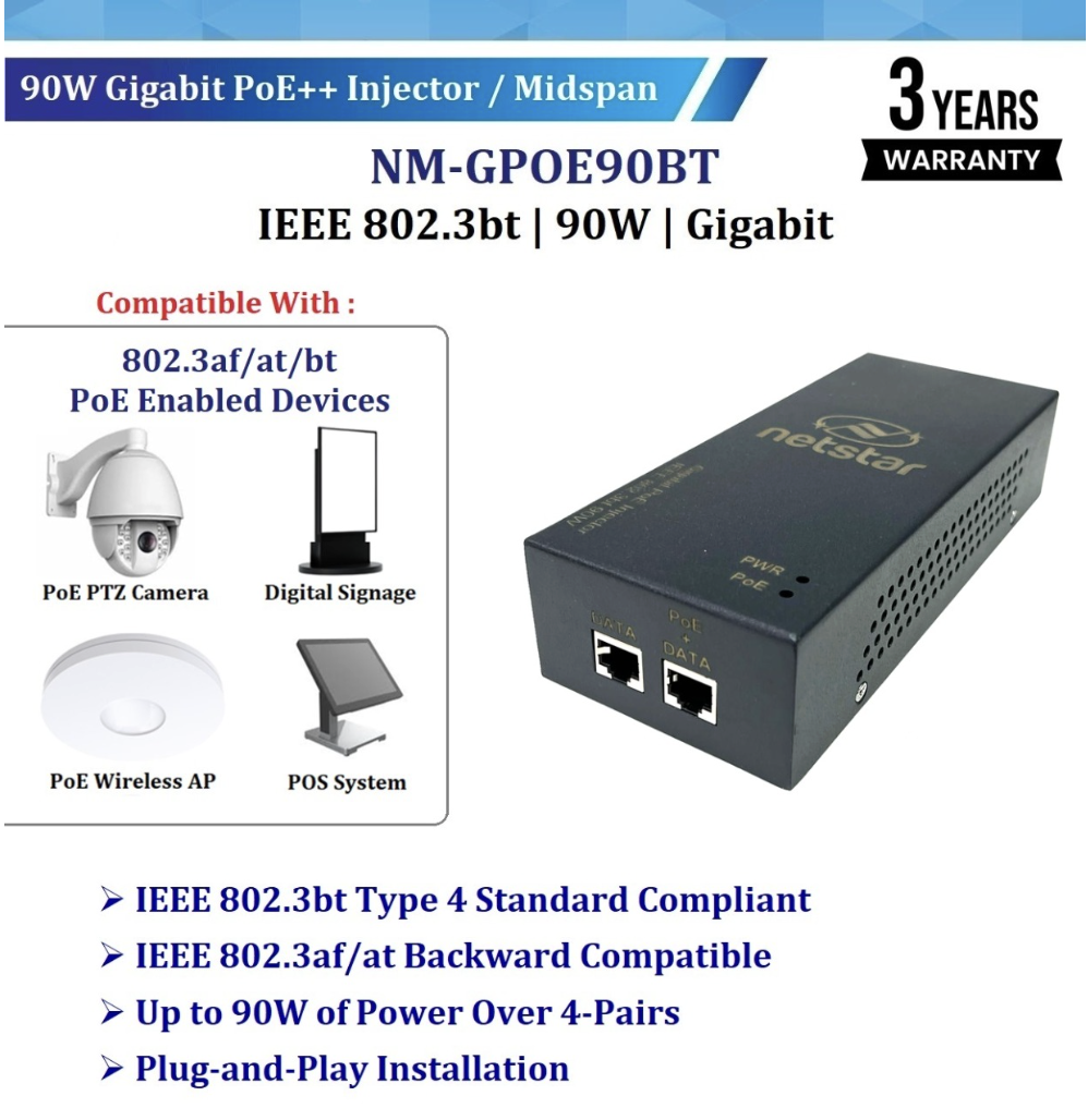 The Netstar NM-GPOE90BT is the ultimate solution for powering high-performance PoE devices, offering maximum efficiency, reliability, and performance in demanding network environments.