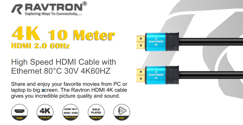 Ravtron HDMI 4K 2.0 Cable 3D 4K 60Hz (10.0 Meter) is designed for high-performance video and audio transmission over extended distances. Ideal for home theaters, gaming setups, and professional environments, this 10-meter HDMI cable supports 4K resolution, HDR, and 3D content, ensuring high-quality, lag-free signal transmission.