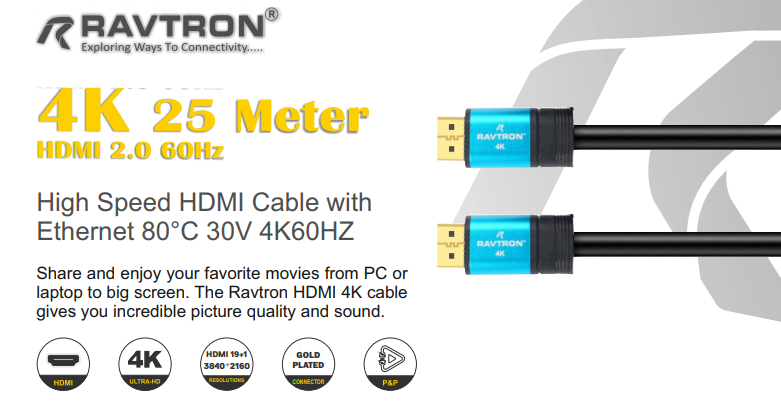 Ravtron HDMI 4K 2.0 Cable 3D 4K 60Hz (25 Meter) is expertly designed for long-distance video and audio transmission, making it ideal for large setups where high-quality connectivity is crucial. Supporting 4K resolution, HDR, and 3D content, this cable ensures stunning visual and audio performance for home theaters, conference rooms, classrooms, or professional AV installations.