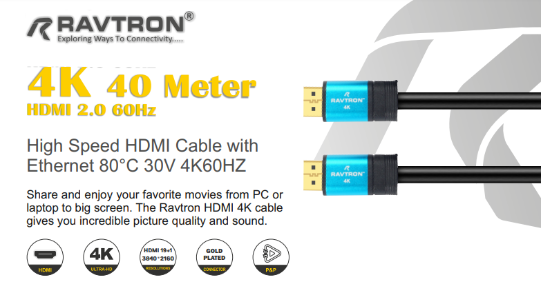 The RAVTRON HDMI 2.0 Cable 3D 4K 60Hz (40 Meter) is the ultimate choice for users seeking high-quality, long-distance HDMI connectivity. Perfect for expansive home theater systems, corporate environments, and professional AV setups, this cable guarantees exceptional performance in both video and audio, ensuring a seamless and immersive viewing experience.