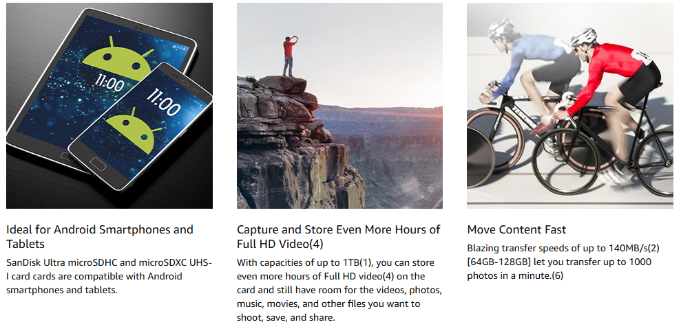 SanDisk Ultra® microSDHC™ and microSDXC™ UHS-I cards are compatible with Android™ smartphones and tablets, Chromebooks, and Windows® laptops. Just insert the card to instantly increase available storage space—at a great value relative to alternatives. New Windows® convertible and ultra-light laptop users, in particular, who were accustomed to the multiple terabytes of storage common on larger laptops will appreciate cards enabling more private physical storage.