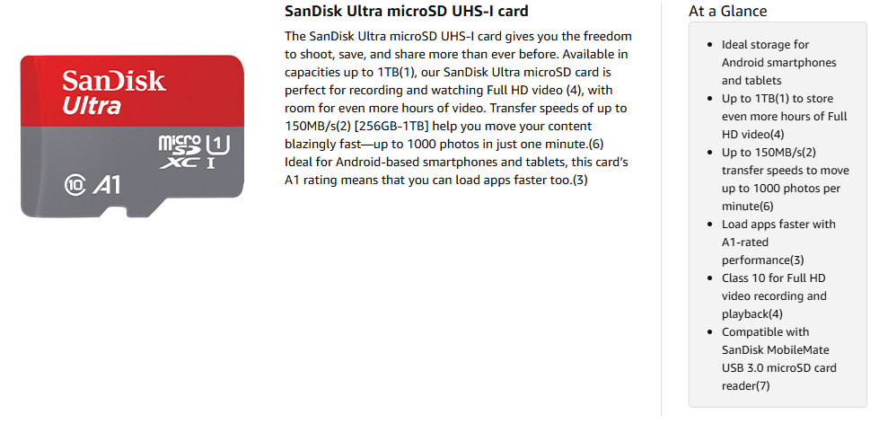 The SanDisk 1TB Ultra microSD Card provides massive storage capacity and fast performance for smartphones, tablets, cameras, and other compatible devices. SanDisk 1TB Ultra microSD Card comes with read speeds of up to 150MB/s, it ensures quick file transfers, smooth app performance, and reliable Full HD video recording. SanDisk 1TB Ultra microSD Card is certified A1 for app performance, this card is optimized for Android devices, enabling faster app loading and responsiveness.