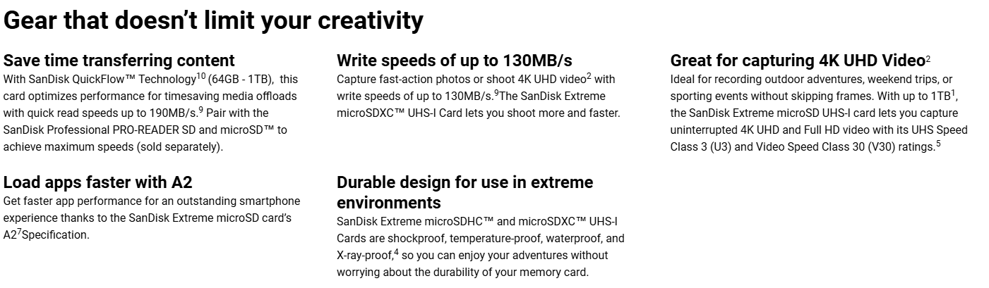 Capture fast-action photos or shoot 4K UHD video2 with write speeds of up to 130MB/s.9The SanDisk Extreme microSDXC™ UHS-I Card lets you shoot more and faster.