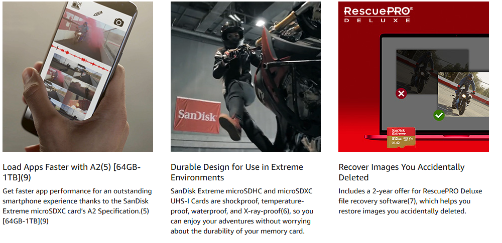 Ideal for recording outdoor adventures, weekend trips, or sporting events without skipping frames. With up to 1TB1, the SanDisk Extreme microSD UHS-I card lets you capture uninterrupted 4K UHD and Full HD video with its UHS Speed Class 3 (U3) and Video Speed Class 30 (V30) ratings.5