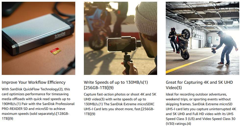 Ideal for recording outdoor adventures, weekend trips, or sporting events without skipping frames. With up to 1TB1, the SanDisk Extreme microSD UHS-I card lets you capture uninterrupted 4K UHD and Full HD video with its UHS Speed Class 3 (U3) and Video Speed Class 30 (V30) ratings.5