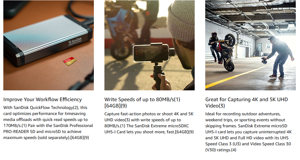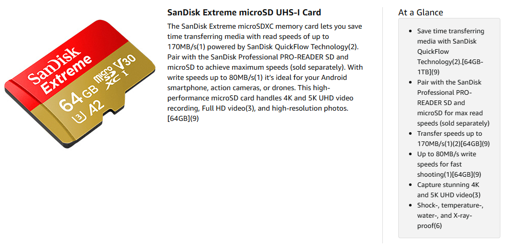 Best ForBasic use, Full HD recording, smartphones4K UHD video, action cameras, drones, DSLRs