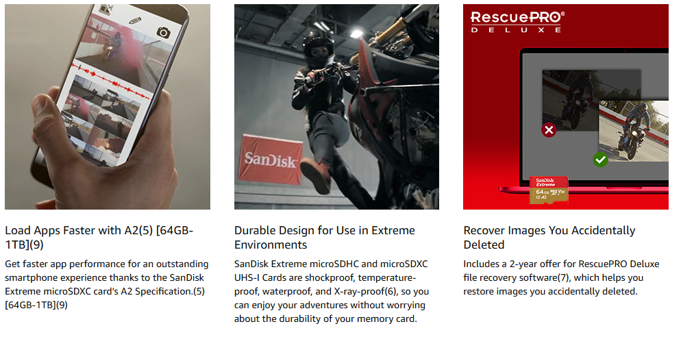 SanDisk Extreme microSDHC™ and microSDXC™ UHS-I Cards are shockproof, temperature-proof, waterproof, and X-ray-proof,4 so you can enjoy your adventures without worrying about the durability of your memory card.