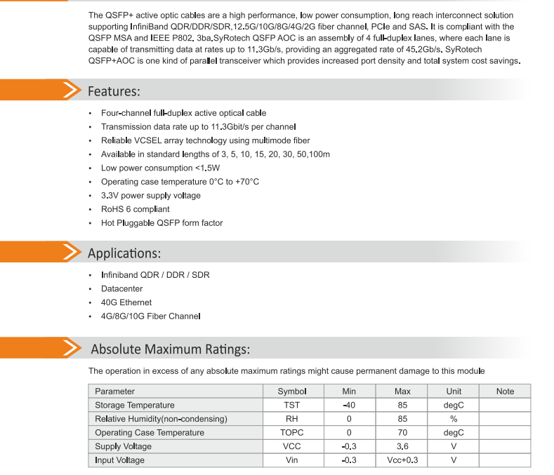 The Syrotech GOXQ-CAB-QSFP-A10M is an excellent choice for high-performance, short-distance 40G networking. Its active optical design enhances signal reliability and is ideal for applications requiring reduced cable weight and power consumption.