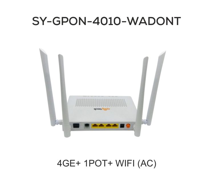 The Syrotech SY-GPON-4010-WADONT is a dual-band GPON ONT with 4 Gigabit LAN ports, delivering high-speed internet and seamless Wi-Fi connectivity for modern FTTH deployments.