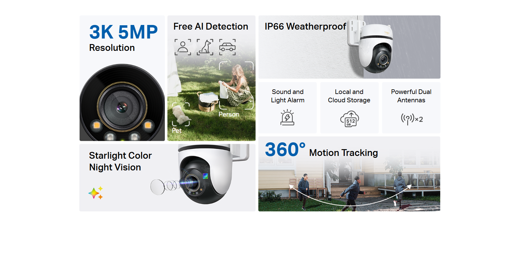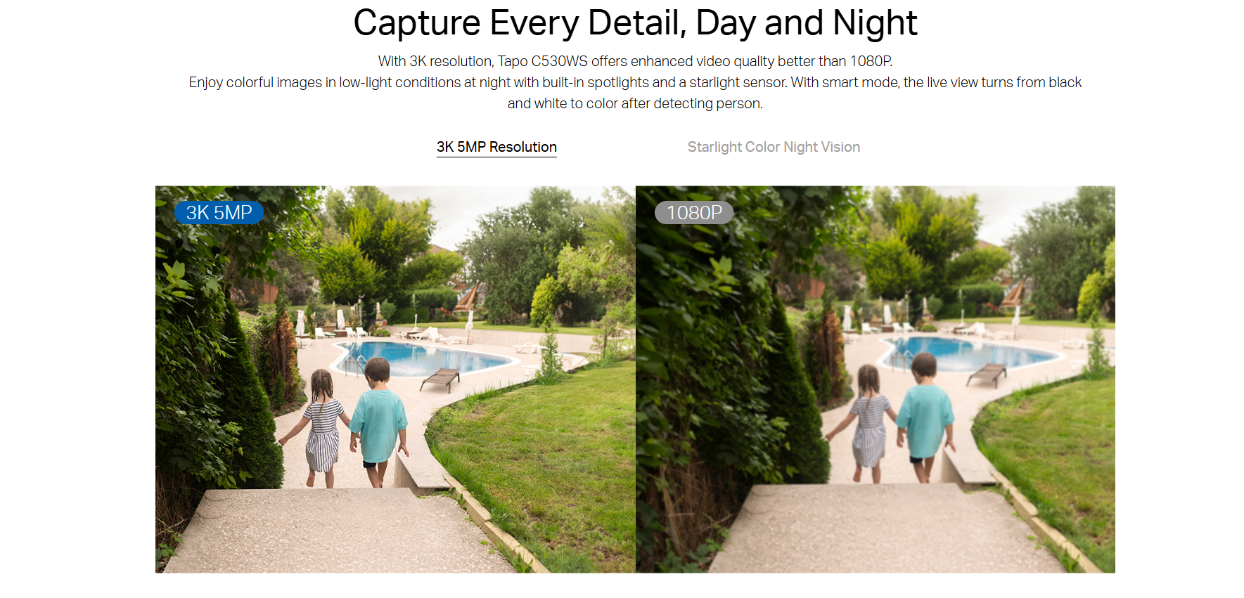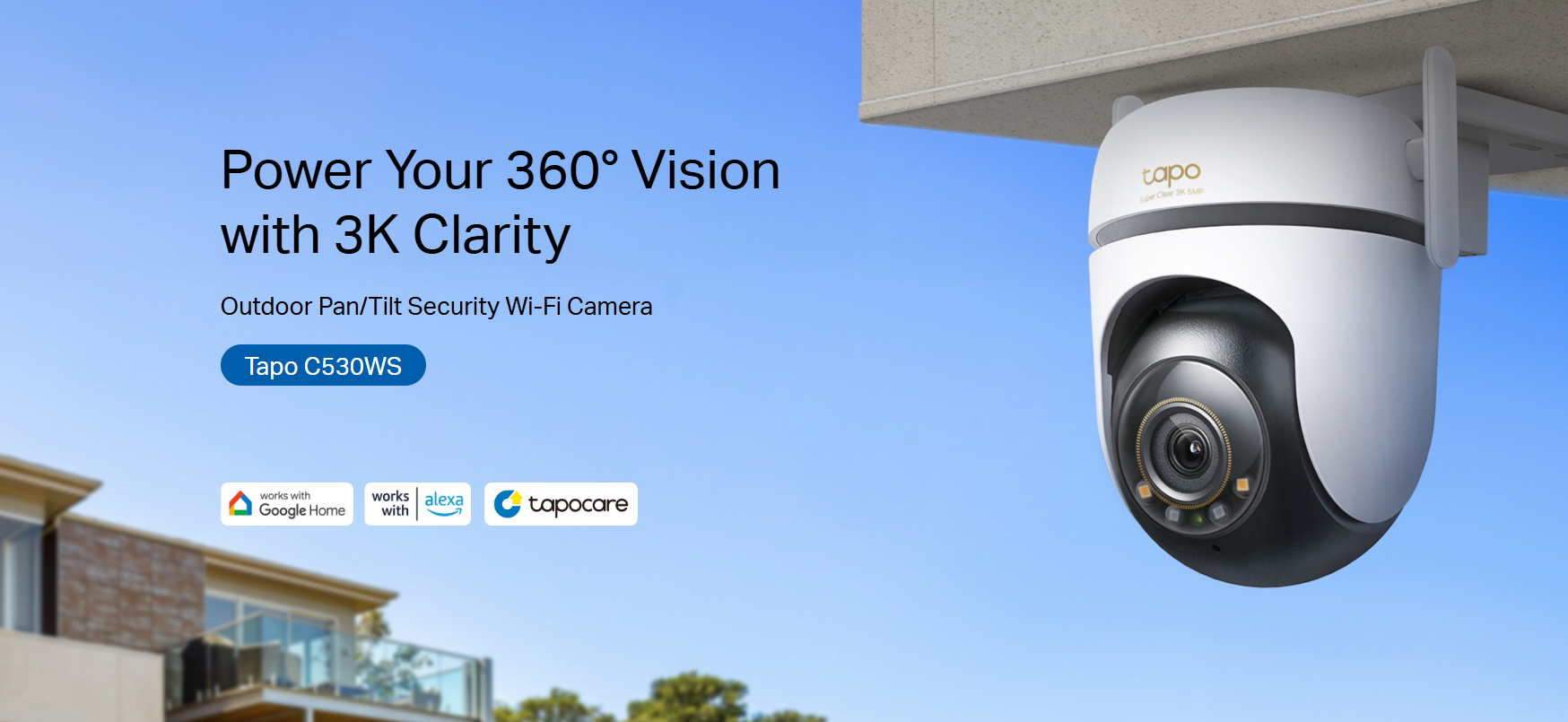 The Tapo C530WS Outdoor Pan/Tilt Security Wi-Fi Camera delivers advanced surveillance with 3K 5MP resolution, ensuring crystal-clear images for enhanced security. Tapo C530WS is equipped with a 1/3” Progressive Scan CMOS Starlight Sensor, 112° wide field of view, and mechanical pan and tilt (340° and 60° respectively), Tapo C530WS camera provides comprehensive 360° coverage of outdoor areas.