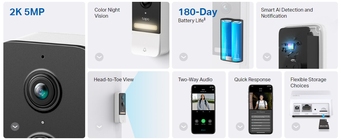 The Tapo D230S1 doorbell offers 2K 5MP live view, color night vision, and a wide 160° FOV for full head-to-toe coverage. It includes flexible placement, a long-lasting battery, Smart AI detection, two-way audio, local and cloud storage, anti-theft alarm