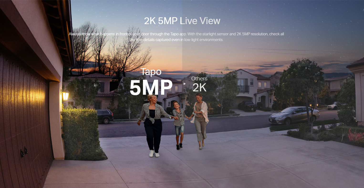 • 2K 5MP Live View: Always know what happens in front of your door through the Tapo app. With the starlight sensor and 2K 5MP resolution, check all the fine details captured even in low-light environments.