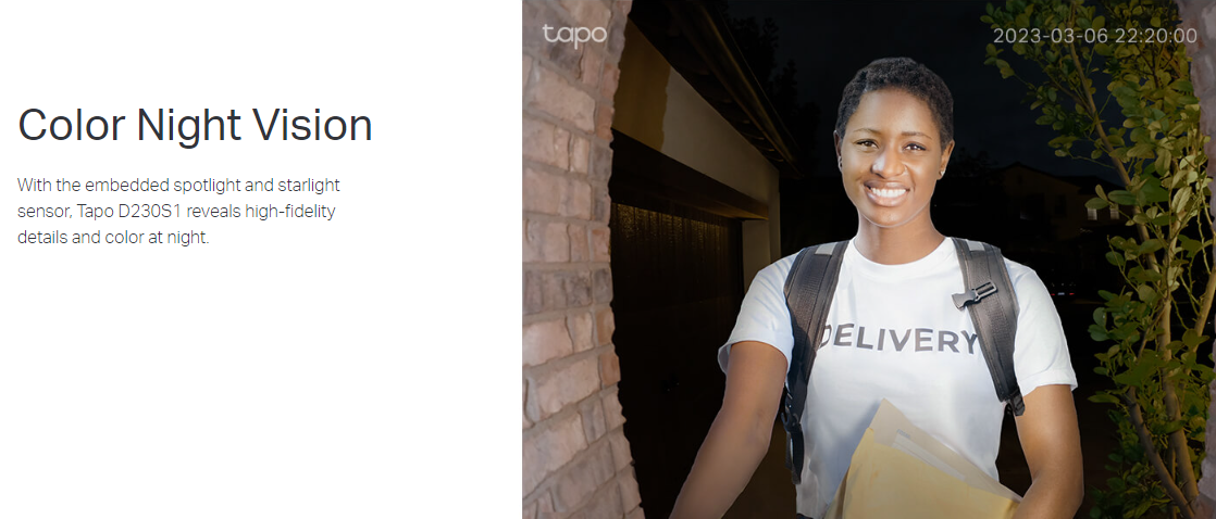 • Color Night Vision: With the embedded spotlight and starlight sensor, Tapo D230S1 reveals high-fidelity details and color at night.