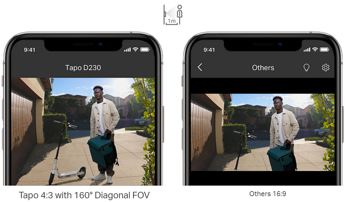 • Head-to-Toe View: With the camera’s ultra-wide FOV(160° Diagonal), Tapo 4:3 live view ensures users can check visitors from head-to-toe as close as 1m, which shows more vertical details than other 16:9 doorbells’.