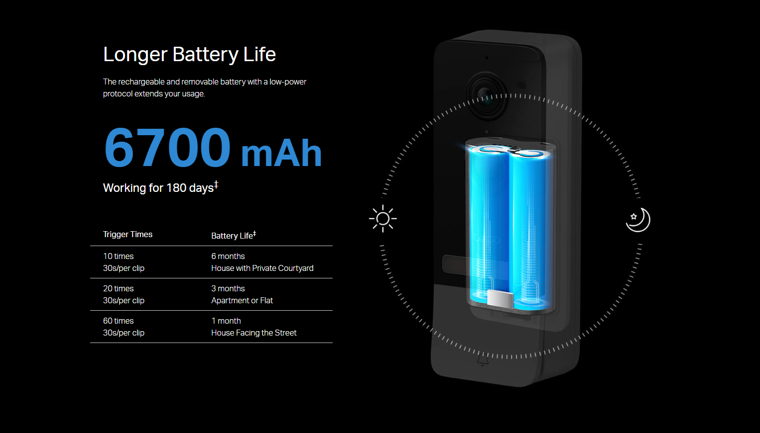 Power SourceDoorbell: 6700 mAh Removable Rechargeable Lithium-ion Battery Hub: 9V DC Power Adapter