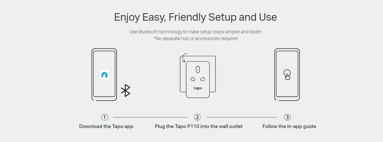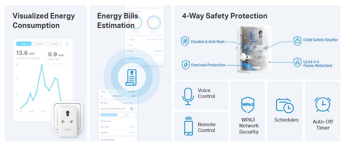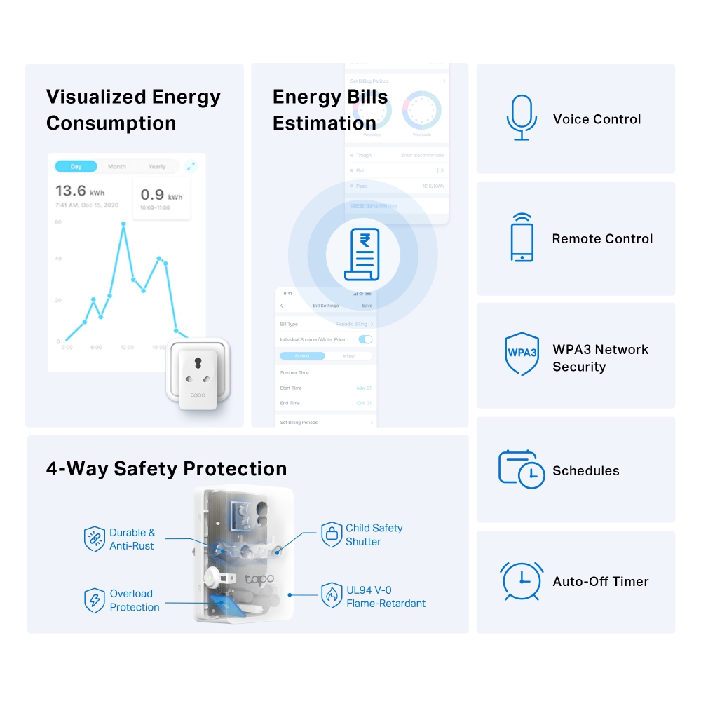 • Energy Monitoring – Monitor real-time power consumption and energy spend via the Tapo App