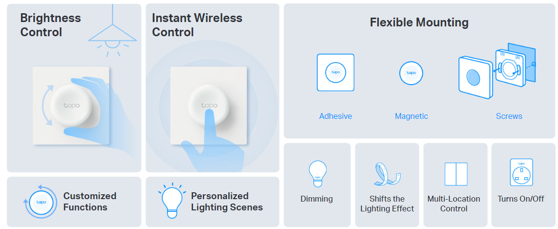 The Tapo S200D smart remote dimmer switch offers instant, app-free control over lights and devices with multiple customizable actions (single tap, double tap, rotation), supports control from various locations, and has flexible mounting options. It’s easy to set up and boasts over a year of battery life.