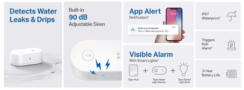 • Hub Required – TAPO T300 Triggers the Hub alarm when leakage is detected. Manage up to 64 sensors with one hub.