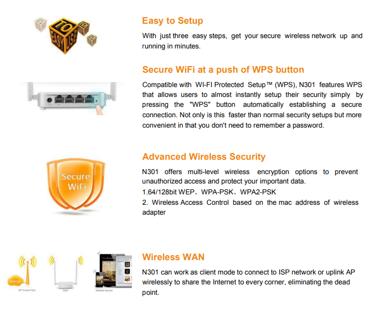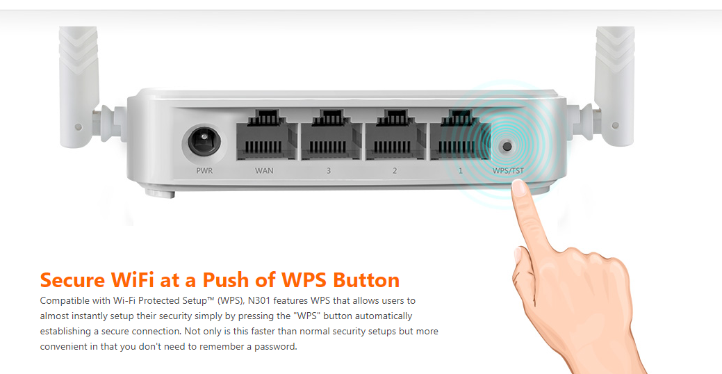 N301 is Designed with ease of use in mind, the Tenda N301 features a simple one-touch setup that allows for quick installation, even for users with little technical experience. The router also supports Wi-Fi Protected Setup (WPS) for an additional layer of security, allowing you to connect devices securely with just a press of a button.