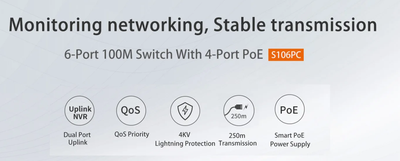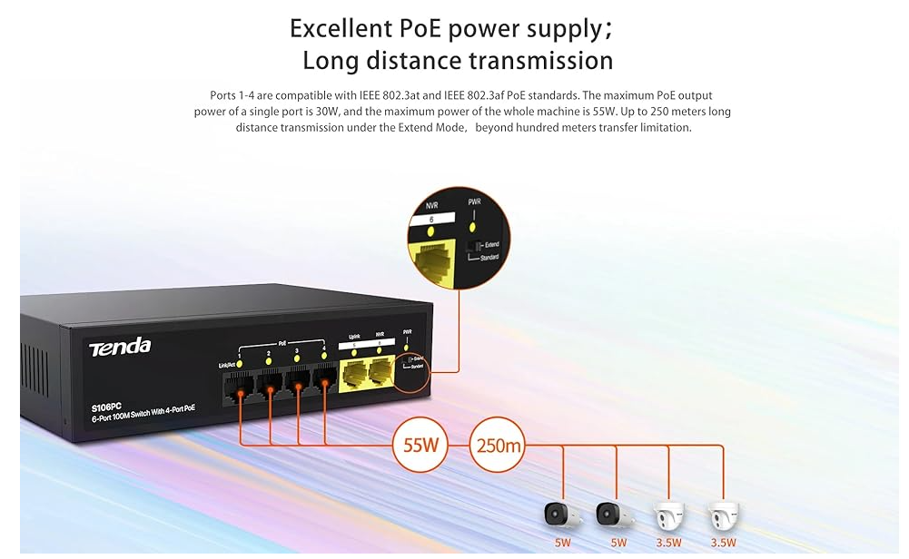Tenda S106PC is Operating at 100Mbps speeds, the Tenda S106PC is well-suited for light network traffic such as video surveillance, basic office use, and other data-heavy tasks requiring a reliable connection. The 4 PoE ports provide a total power budget of 65W, capable of powering a variety of PoE-enabled devices while reducing the need for additional power adapters and cables. This makes it an ideal choice for businesses and homes that want to keep their installations neat and tidy while providing stable power and data connections.