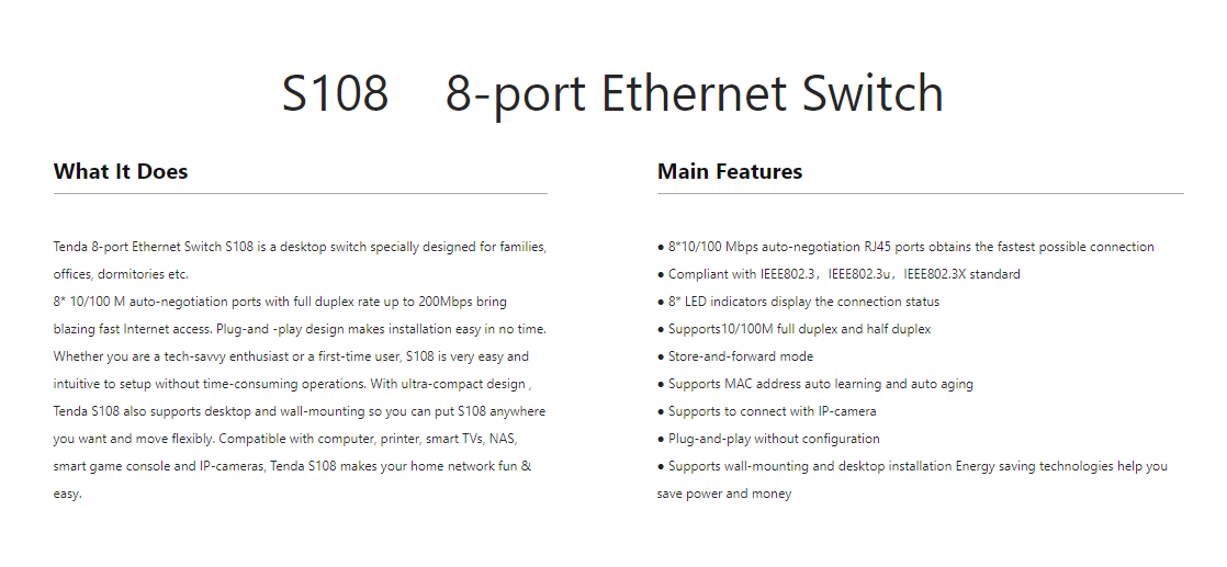 Tenda S108 8 port Ethernet switch with 10/100Mbps speeds for connecting multiple devices like computers, printers, and smart TVs. Plug-and-play setup with auto-negotiation for optimal performance. Compact design and energy-efficient, perfect for home or small office networks.