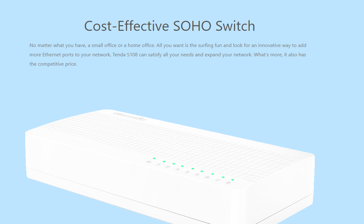 Whether you need to expand your home network, connect multiple devices in a small office, or add extra ports for your entertainment system, the Tenda S108 8-Port Ethernet Switch delivers reliable performance at a budget-friendly price.