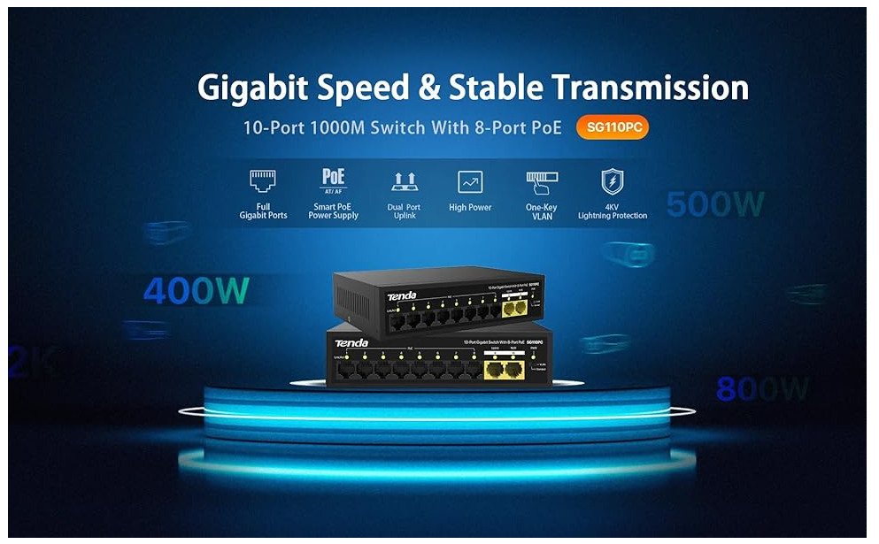 The Tenda SG110PC 10-Port Gigabit Lite PoE Switch is a powerful and versatile network switch designed to simplify and enhance your connectivity. Tenda SG110PC is Featuring 10 total ports, including 8 Power over Ethernet (PoE) ports, Tenda SG110PC switch enables the simultaneous transfer of both power and data to connected devices such as IP cameras, access points, VoIP phones, and more. Tenda SG110PC comes With Gigabit Ethernet speeds, this switch ensures fast and reliable data transfer, supporting high-bandwidth applications such as video streaming and large file transfers.