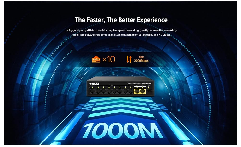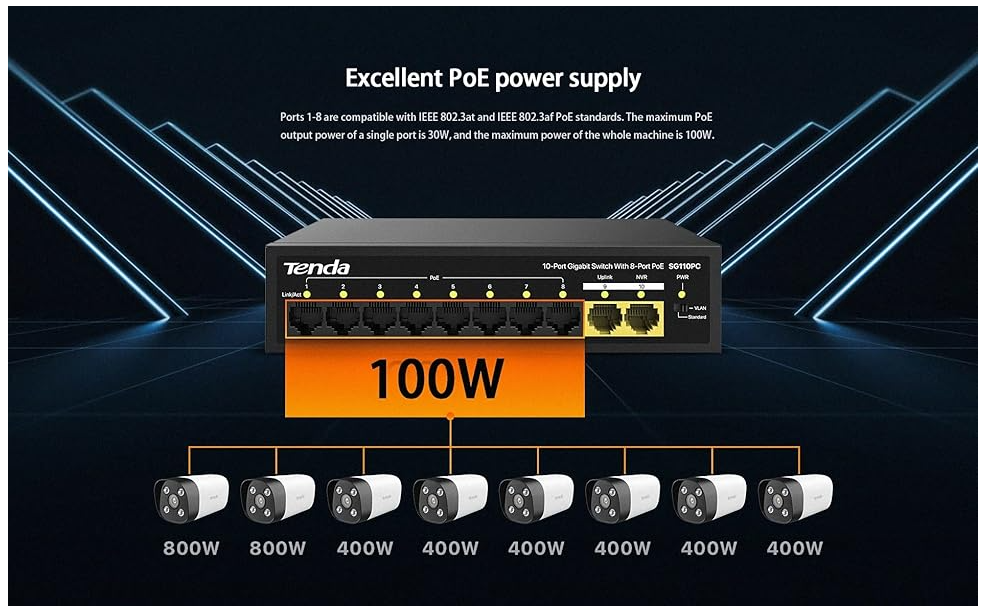 Tenda SG110PC 10-port Gigabit switch with 8 PoE+ ports to power IP cameras, access points, and VoIP phones. Plug-and-play installation and compact design make it perfect for small office or home networks. Expand your network with ease while delivering both power and data over a single cable.
