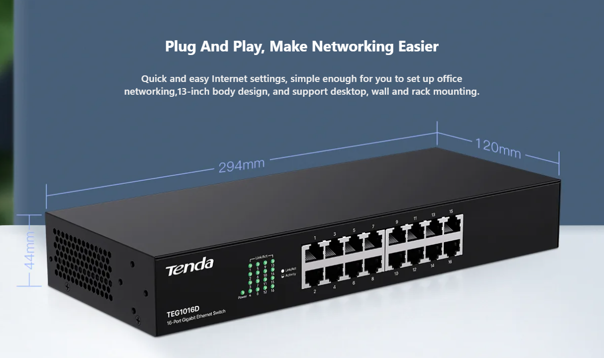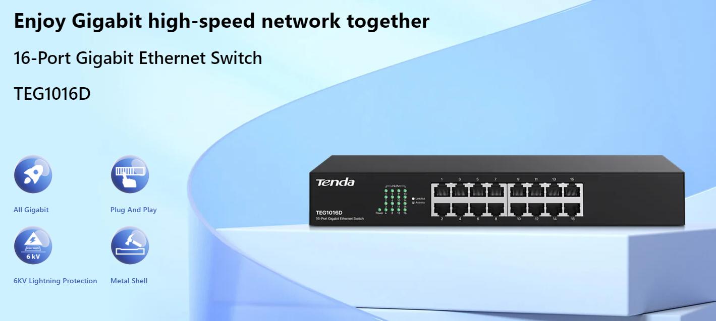 The Tenda TEG1016D is a 16-port Gigabit Ethernet switch designed to deliver high-performance and reliable network connectivity for both home and office environments. Tenda TEG1016D is Offering 16 Gigabit Ethernet ports, Tenda TEG1016D switch enables high-speed data transfer for bandwidth-intensive applications, such as streaming, gaming, file sharing, and video conferencing. Tenda TEG1016D comes With auto-negotiation and plug-and-play functionality, Tenda TEG1016D is extremely easy to set up and use, making it an ideal solution for expanding your network without the need for complicated configuration.